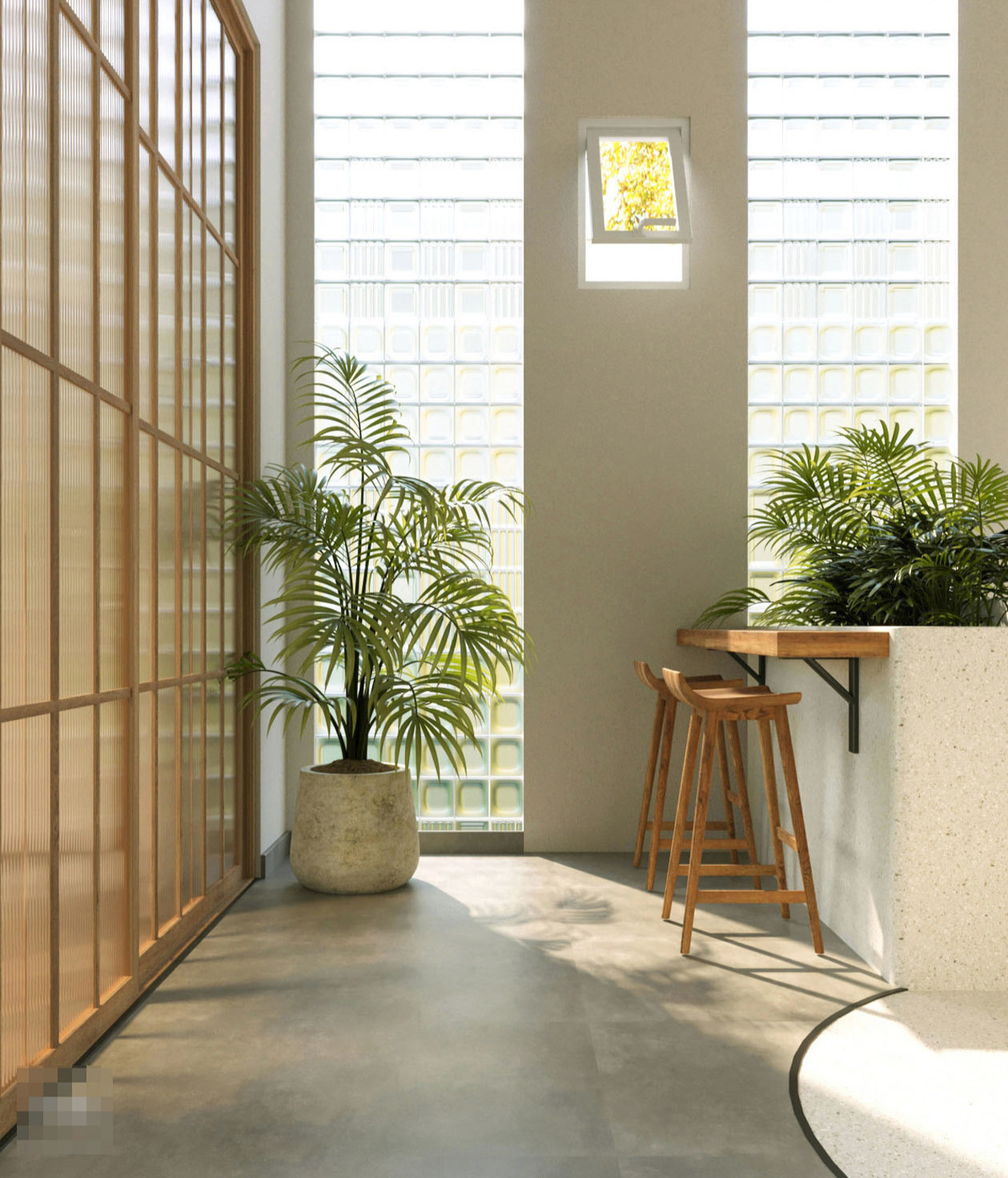 Khu cầu thang dẫn lên các phòng nhóm thiết kế dùng gạch kính lấy sáng, trồng một số cây cảnh để làm thành góc chill đẹp mắt, thêm một bộ bàn gỗ ngồi uống trà là có nơi cho gia chủ nghỉ ngơi, tìm lại sự cân bằng trong cuộc sống.