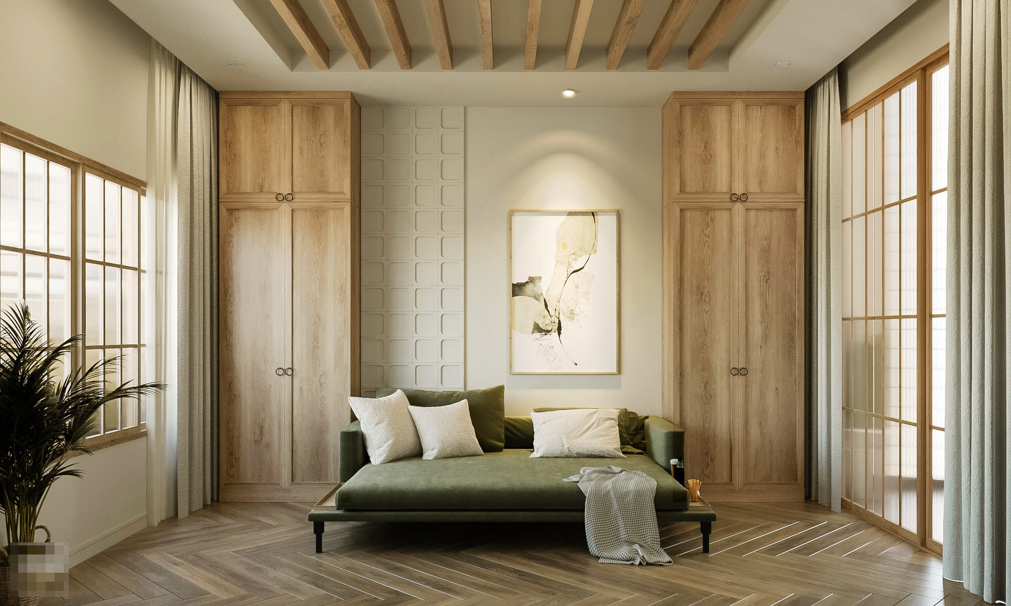 Các phòng ngủ mang tính mở, đưa con người gần gũi thiên nhiên bên ngoài. Một chút mộc mạc, dân dã thể hiện ở hệ trần kiểu xưa.