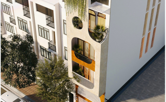 Ngôi nhà ống với mặt tiền đơn giản, gây ấn tượng nhờ những đường bo góc ở ban công cùng sân vườn trên cao rợp cây xanh và hoa.