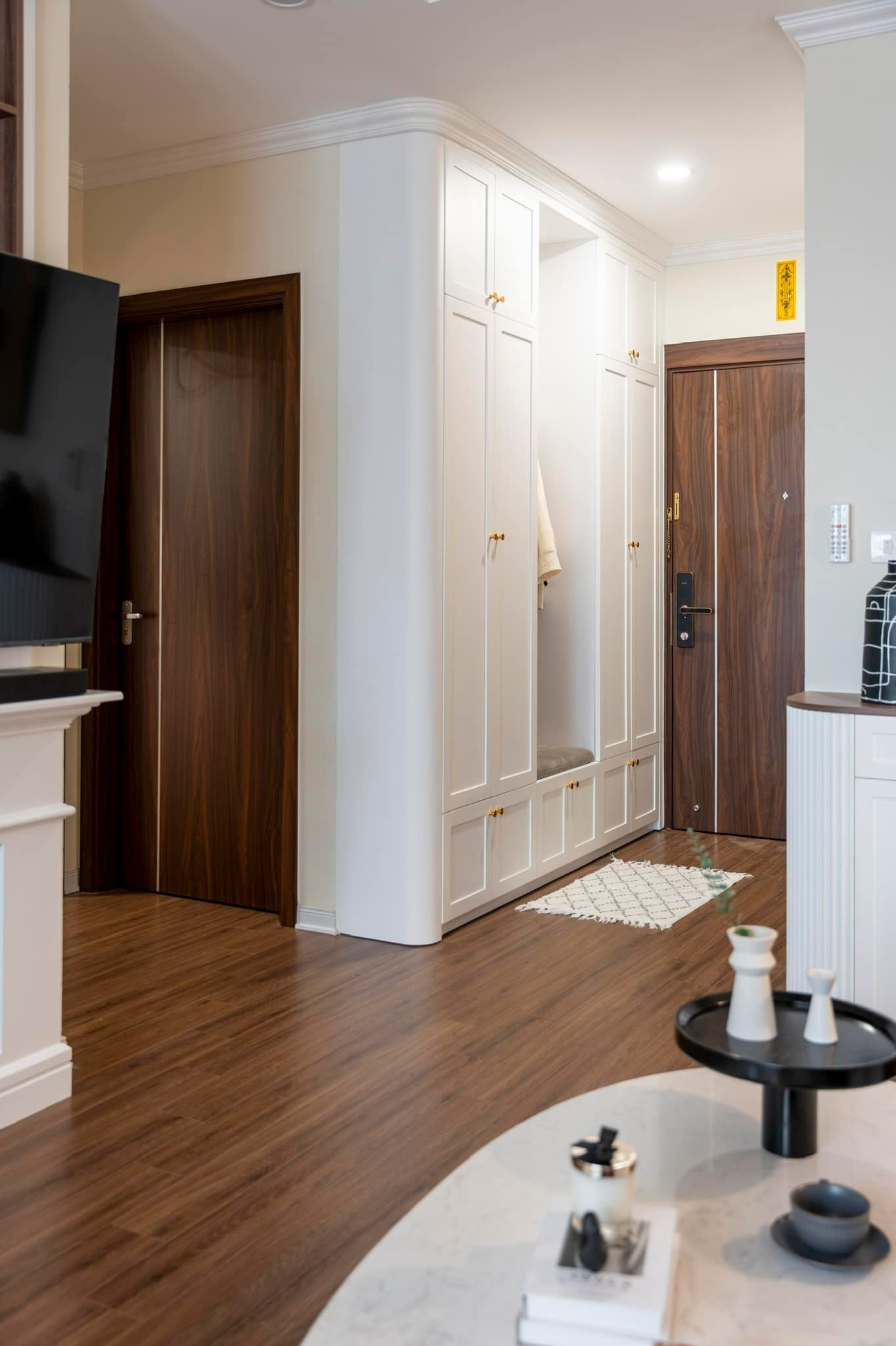 Sảnh tiếp đón đặt tủ kích thước lớn, vừa cất mũ bảo hiểm, treo áo khoác và thật nhiều giầy dép.