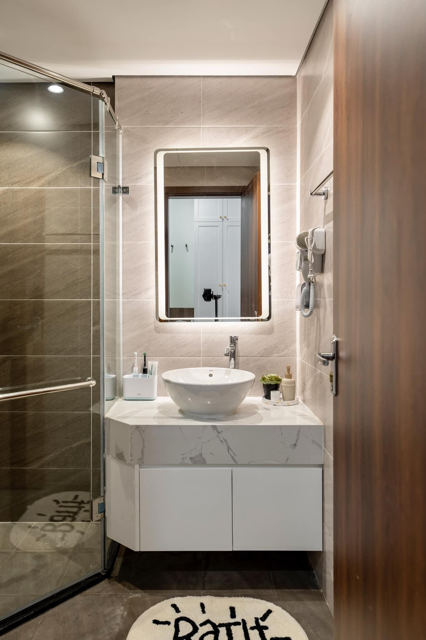 Mọi chi tiết được sắp đặt hợp lý, hài hòa nhất. Chiếc gương gắn đèn led giúp phòng tắm thêm ấm cúng, sang trọng.