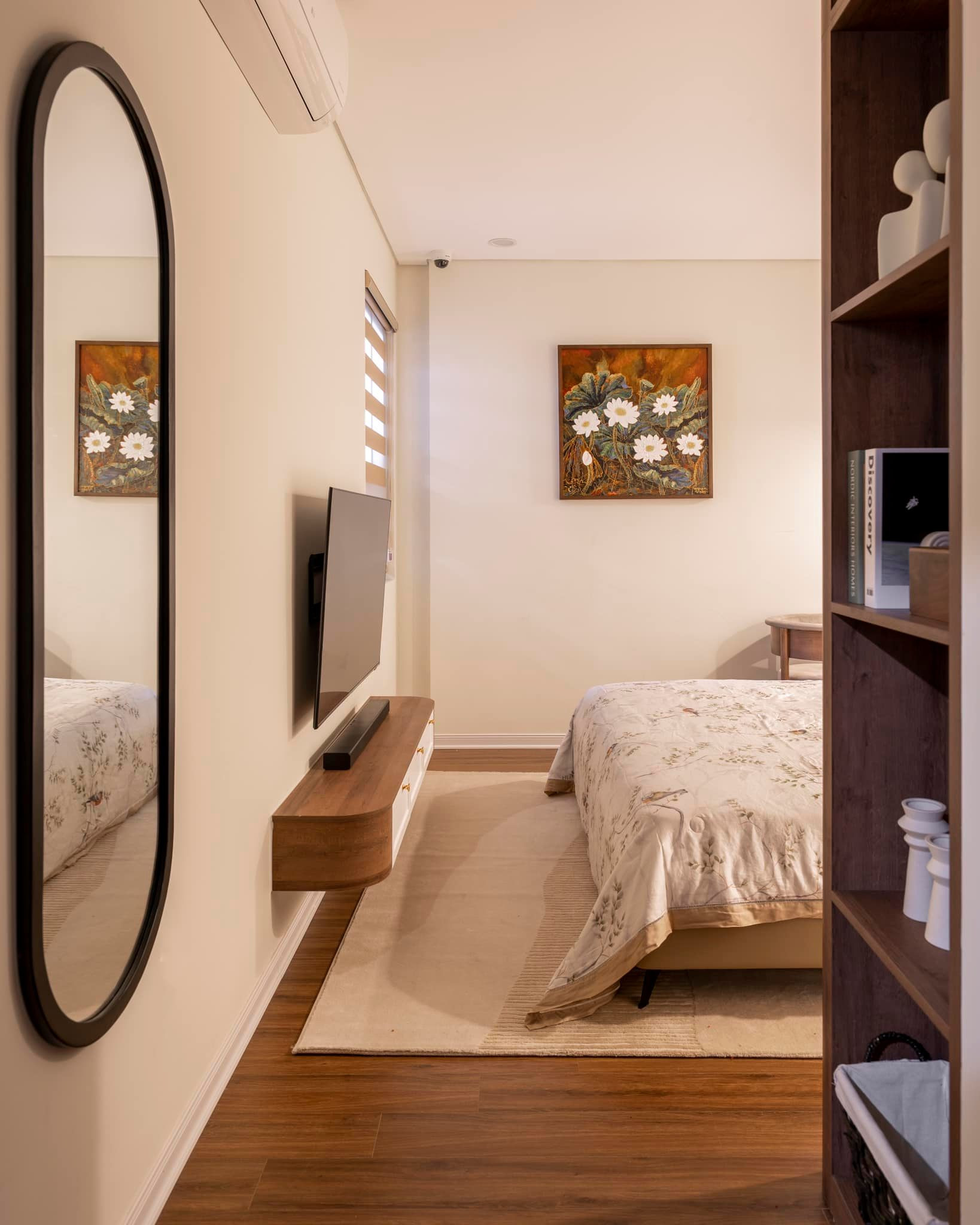 Phòng ngủ vintage dùng gam màu trung tính, nhẹ nhàng. Một chút hoa tươi nơi góc bàn trang điểm cũng đủ làm căn phòng tràn ngập sức sống.