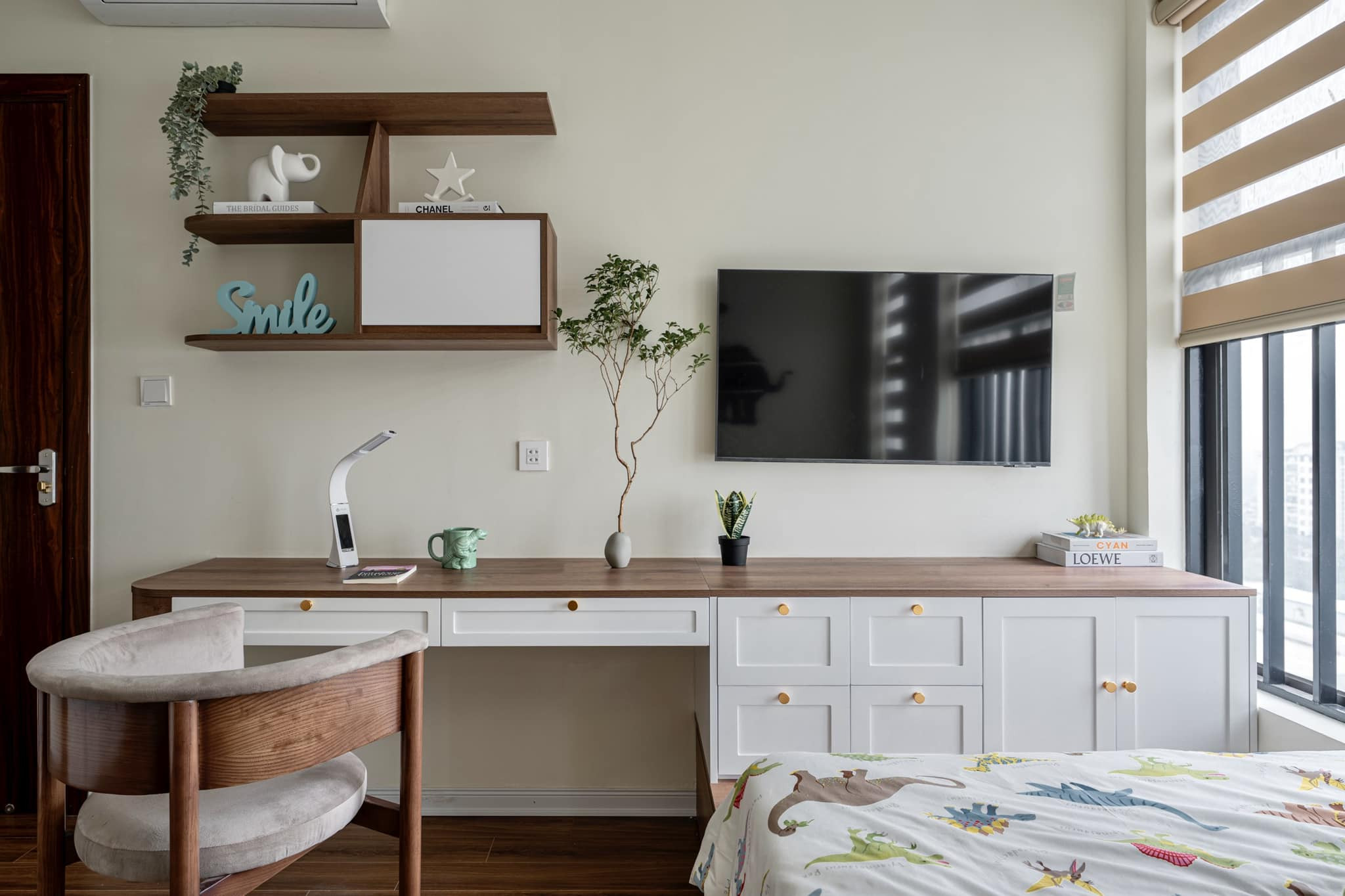 Phòng ngủ bé trai được thiết kế nhiều hộc tủ để bé cất giấu đồ chơi gọn gàng. Do con có niềm đam mê với khủng long nên chị Mai Anh mua tranh, ảnh, đồ decor hình loại động vật này.