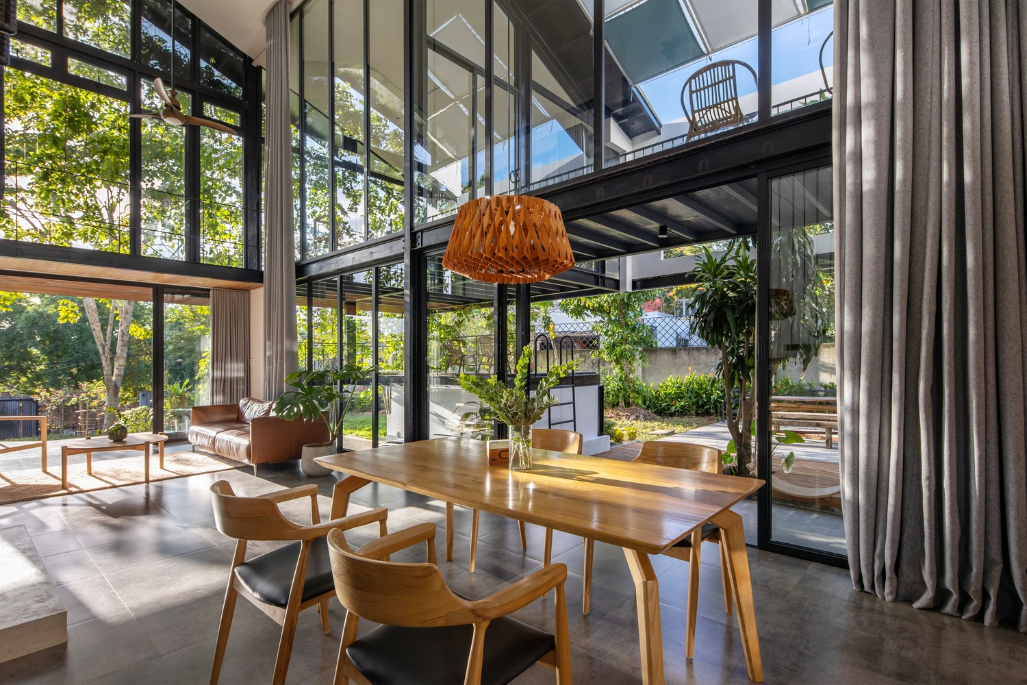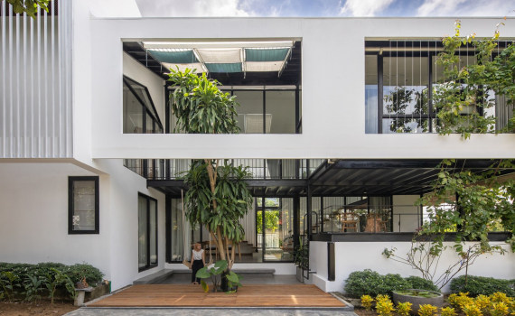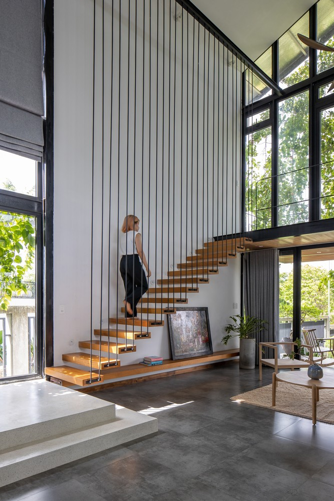 Khu vực bóng mát giữa tầng 2 và tầng lửng đóng vai trò như một vùng đệm không khí, giúp ngôi nhà được thông gió và làm mát.