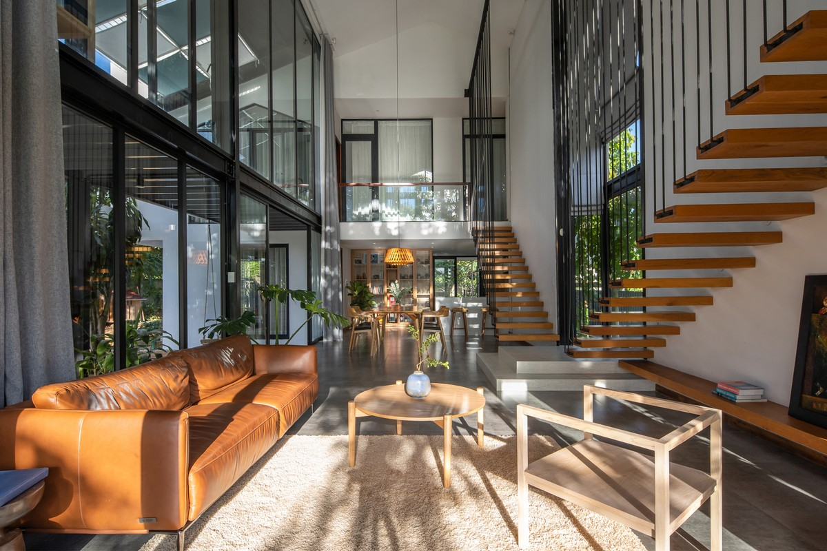 Từ tầng 1 đến tầng 2, các không gian được liên kết với nhau bằng chuỗi liên kết cầu thang, hành lang, sân thượng bao quanh khoảng trống giữa nhà. Khoảng trống lớn thúc đẩy đối lưu không khí làm mát ngôi nhà và mở rộng tầm nhìn từ ngôi nhà ra các sườn đồi.