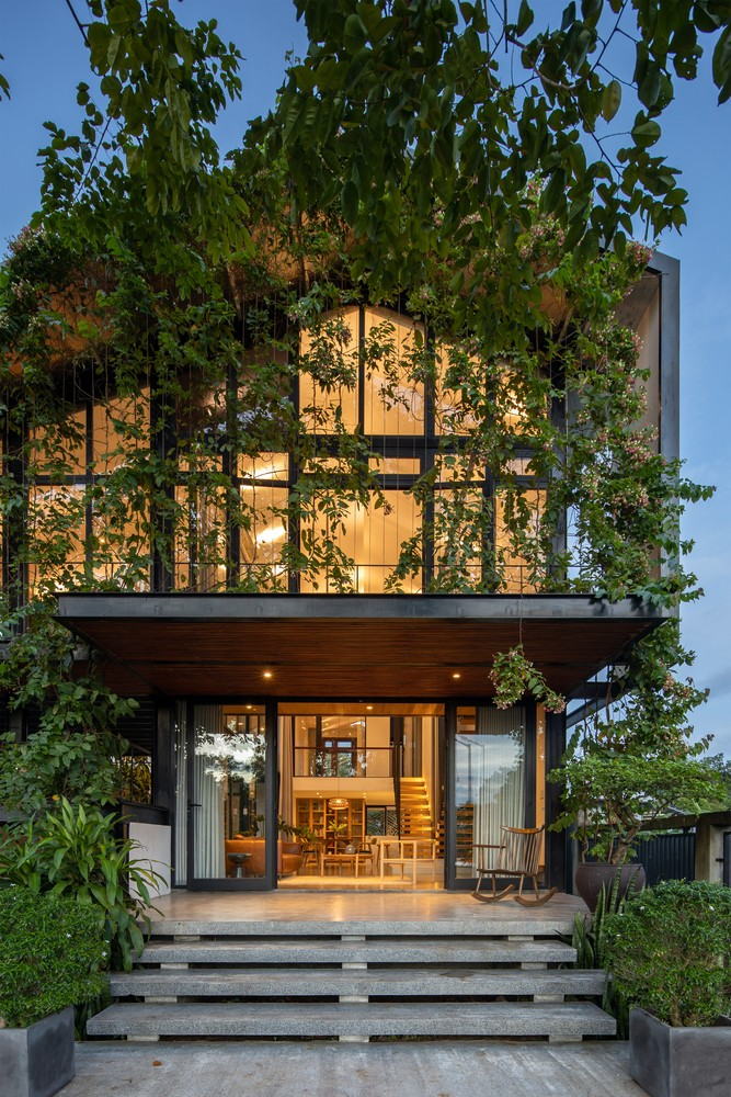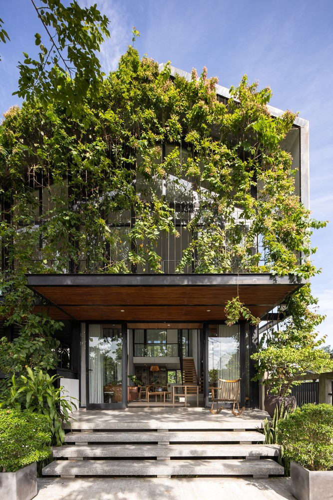 Mặt đứng với hệ thống dây leo xanh dọc theo mái nhà, hành lang và ban công giúp điều tiết ánh nắng trực tiếp chiếu vào đồng thời cho phép các vệt nắng chiếu vào khoảng trống một cách hiệu quả và mang lại sự riêng tư cho khu vực bên trong.