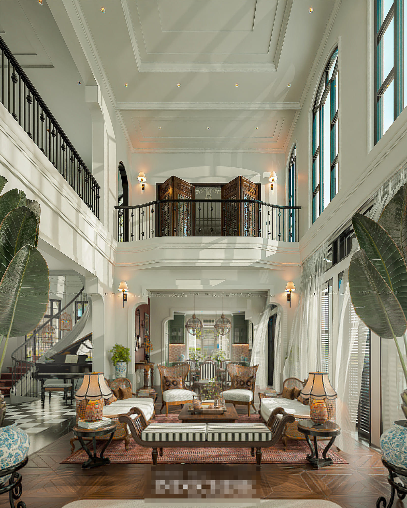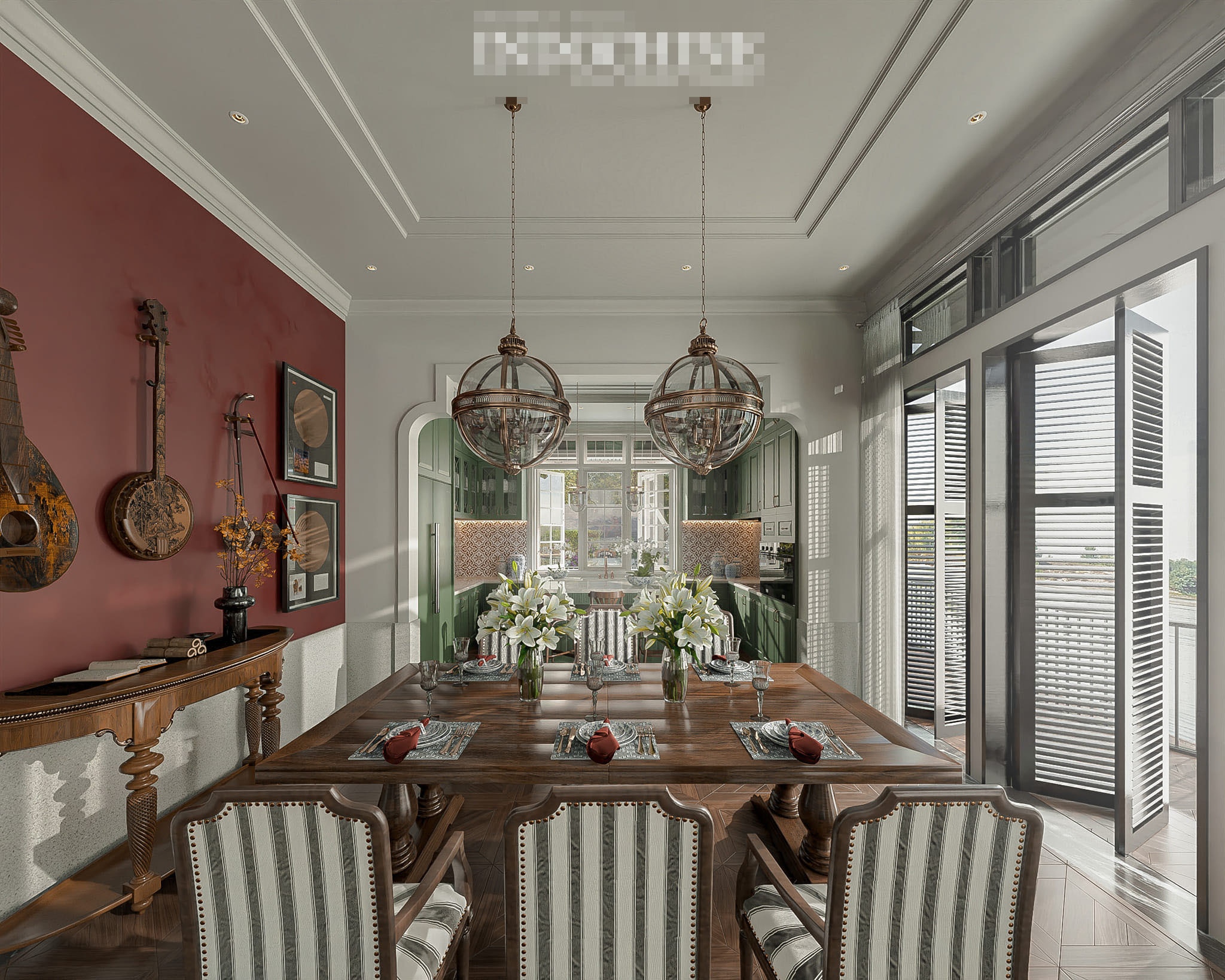 Villa thiết thế theo phong cách Indochine mang hơi thở thời gian nhưng tích hợp yếu tố hiện đại, đầy đủ công năng. Công trình sử dụng gam màu xanh, trắng, vàng và đỏ. Hệ thống cửa lá sách đón gió từ hồ vào mát mẻ. Đây là loại cửa truyền thống của Việt Nam với những khe thoáng thông khí. Phần thông tầng cao ráo, tạo sự khoáng đạt cho không gian.