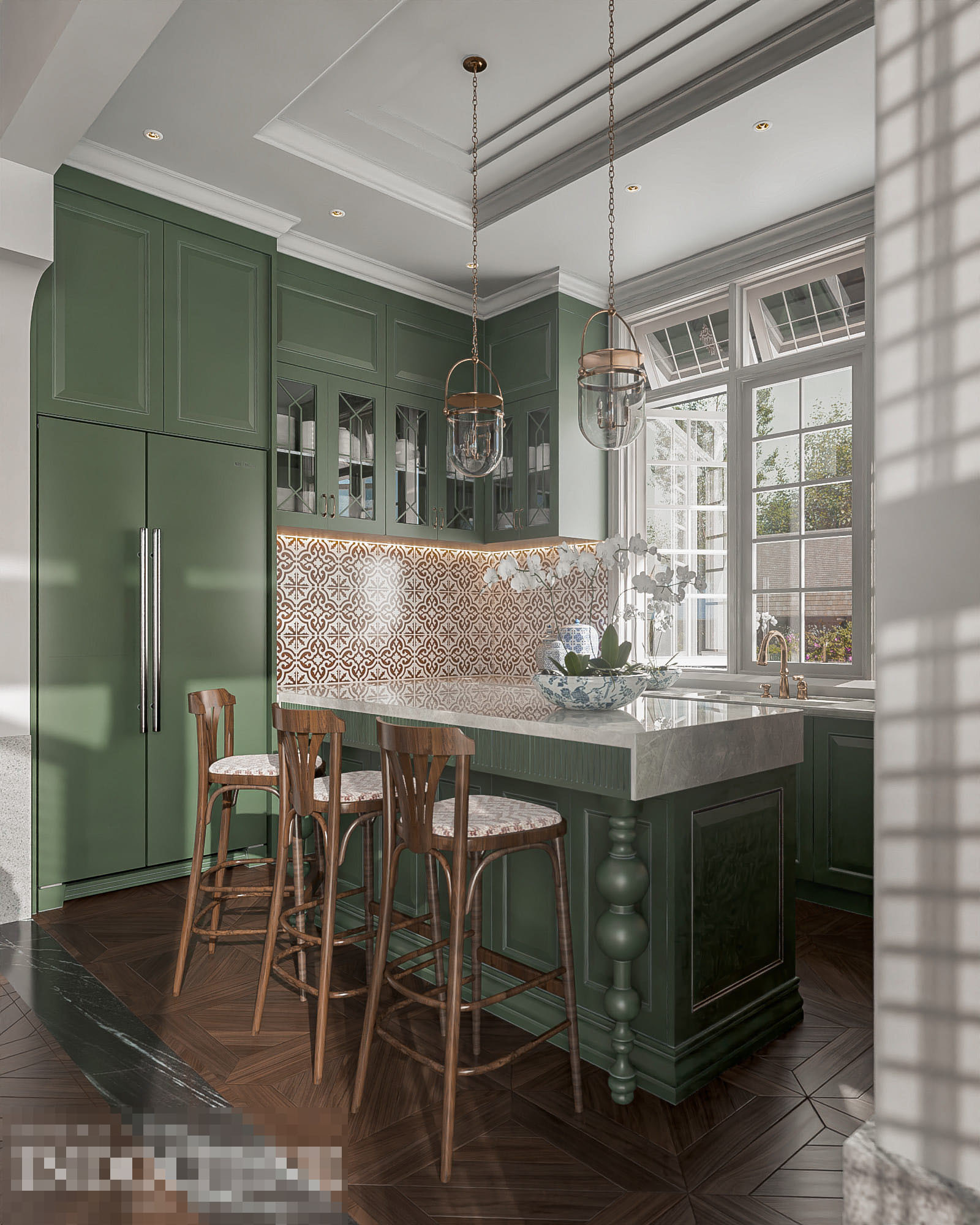 Phòng bếp kểu dáng châu Âu với gam màu xanh cốm mát mẻ, có tầm nhìn ra ngoài thiên nhiên trong lành.