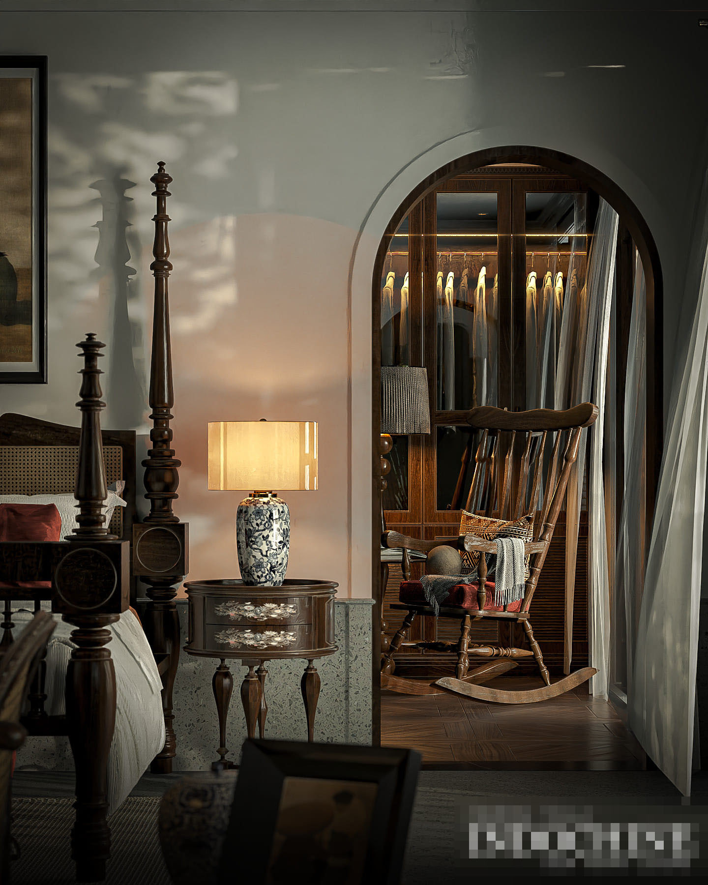 Một chút hoài niệm với bàn trang điểm độc đáo, bình hoa sen làm nổi bật và tôn nên vẻ đẹp tinh tế của phòng.