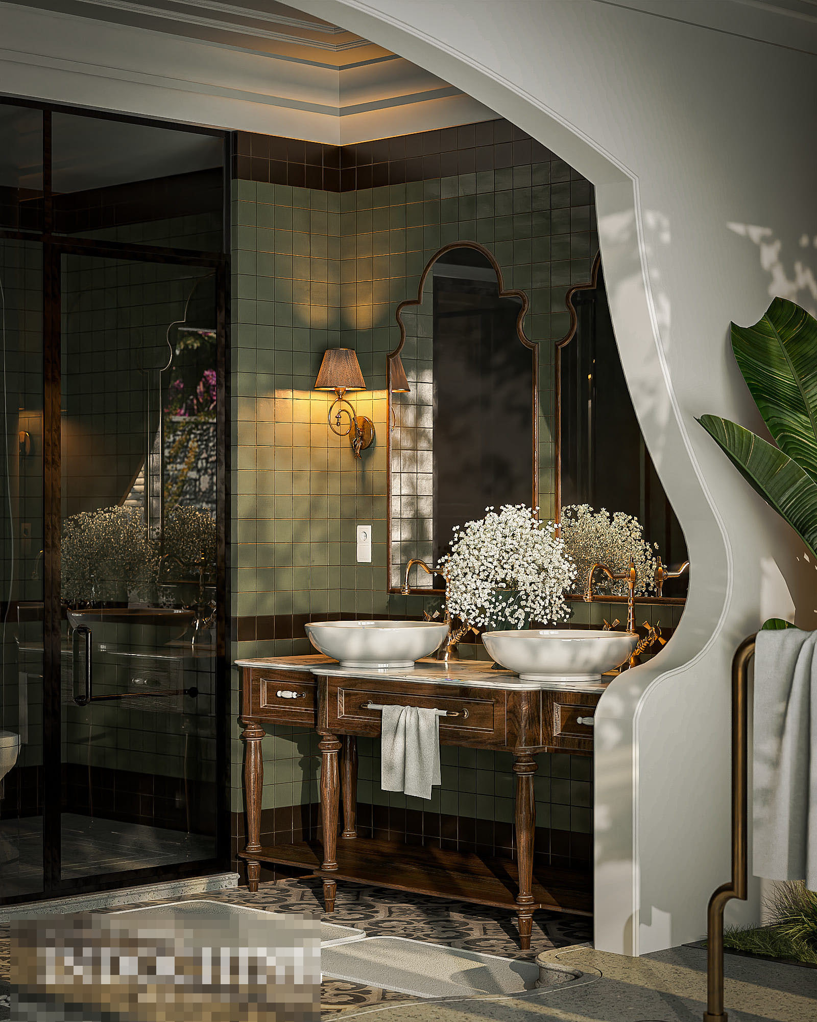 Khu bồn rửa mặt sử dụng bệ bằng chất liệu gỗ ốp đá, vòi sen đồng kiểu cách cổ điển.