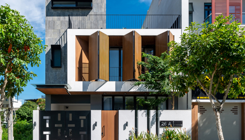 Với mặt tiền hướng Tây, kiến trúc sư lựa chọn dùng hệ lam gỗ tạo khoảng đệm ngăn nắng nóng ảnh hưởng vào bên trong, mà không cản trở tầm nhìn. Hệ lam trượt mở linh hoạt, giúp phòng ngủ luôn thoáng mát và đón nắng buổi sáng.