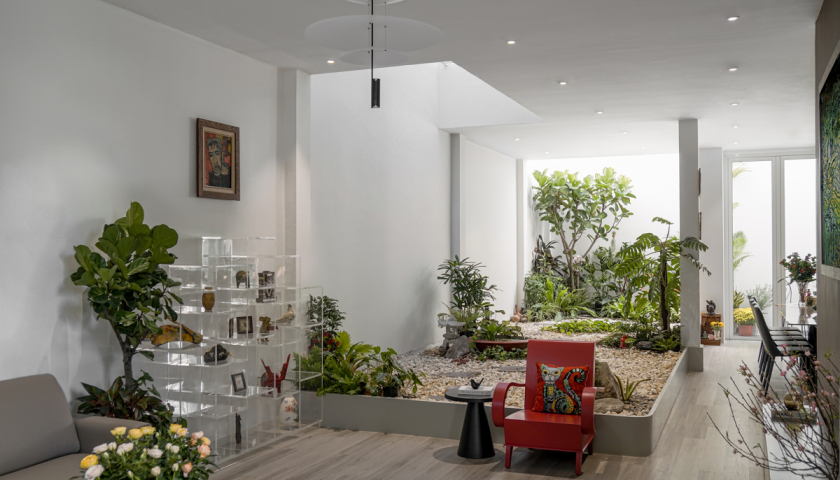 Khu vườn cây nằm dưới giếng trời vừa có chức năng làm mát không gian, mang ánh sáng tự nhiên vào bên trong nhà và mang lại cảm giác yên bình, thư giãn.
