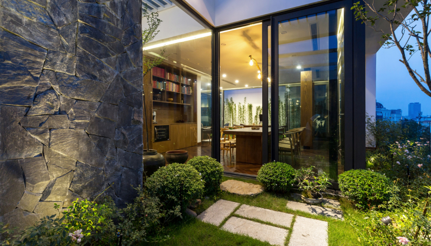 Nhờ hệ cửa kính linh hoạt, không gian trong nhà gần như không có khoảng cách với cây cối, thiên nhiên xung quanh