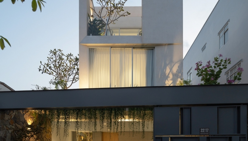 Gia chủ là một đôi vợ chồng trẻ, mong muốn sở hữu không gian sống tối giản, thể hiện đồng nhất từ kiến trúc, nội - ngoại thất. Để tạo sự kết nối nhẹ nhàng giữa công trình và thiên nhiên, kiến trúc sư đã bố trí các mảng xanh lớn nhỏ nằm xen kẽ theo từng không gian ở cả 4 phía: trước - sau - trên và hông công trình. Nhờ vậy, nằm ở trung tâm thành phố nhưng ngôi nhà luôn thoáng đãng, tràn ngập ánh sáng, không có cảm giác ngột ngạt, bí bách.