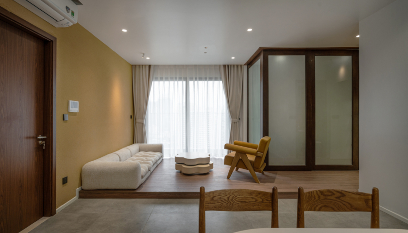 Nhược điểm của các căn hộ chung cư là không gian bị chia nhỏ, dẫn đến cảm giác bí bách. Vì vậy, dựa trên nhu cầu sử dụng của gia chủ, kiến trúc sư chọn phương án nới rộng không gian sinh hoạt chung bằng cách phá bỏ tường ngăn phòng ngủ phụ, thay bằng vách kính linh hoạt.