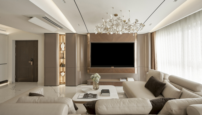 Căn hộ được phân chia không gian khu sinh hoạt chung và hành lang dẫn vào các phòng ngủ thông qua độ cao của sàn, kết hợp thiết kế uốn cong mềm mại.