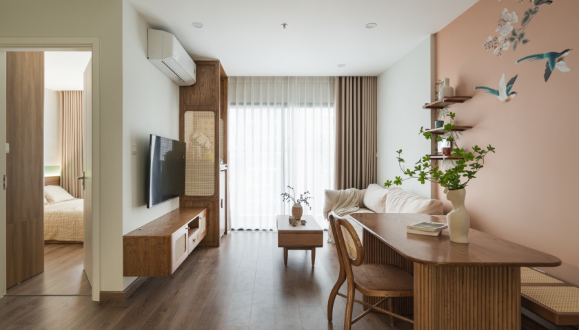 Công năng chính gồm khu vực tiếp khách, bếp - ăn, hai phòng ngủ và một vệ sinh. Các không gian chính của căn hộ có lợi thế nhiều ánh sáng tự nhiên, nhưng nhược điểm lớn nhất là diện tích nhỏ hẹp. Kiến trúc sư đã chọn phong cách thiết kế mang hơi hướng cổ điển, tiết giảm các chi tiết nội thất. Vật liệu chủ đạo là gỗ công nghiệp kết hợp phủ veneer gỗ sồi, vừa đảm bảo thẩm mỹ vừa tối ưu chi phí.