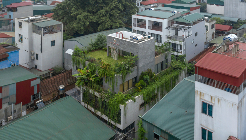 Mặt đứng ngôi nhà được bao phủ bởi lớp cây xanh dày đặc, xuyên suốt từ mái, sân thượng cho đến cửa sổ, mặt tiền, vừa gần gũi với thiên nhiên, vừa giúp điều hòa nhiệt độ cho các phòng chức năng.