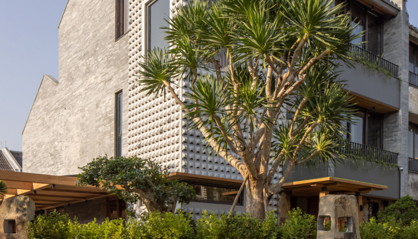 Công trình có quy mô ba tầng, với tổng diện tích sàn 342m2, tọa lạc trên khu đất rộng 345m2 tại Hội An, Quảng Nam.