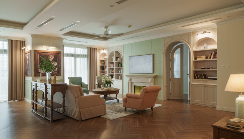 Phong cách thiết kế chủ đạo cho căn hộ là farmhouse - lấy cảm hứng từ các nông trại ở châu Âu. Nội thất mang tone màu xanh dịu mát làm điểm nhấn trên nền trắng kem. Đồ nội thất cũng không quá cầu kỳ, tập trung nhiều vào chất liệu như gỗ sồi Mỹ và vải nỉ Bỉ nhập khẩu, nhằm đem đến cảm giác thoải mái khi sử dụng.