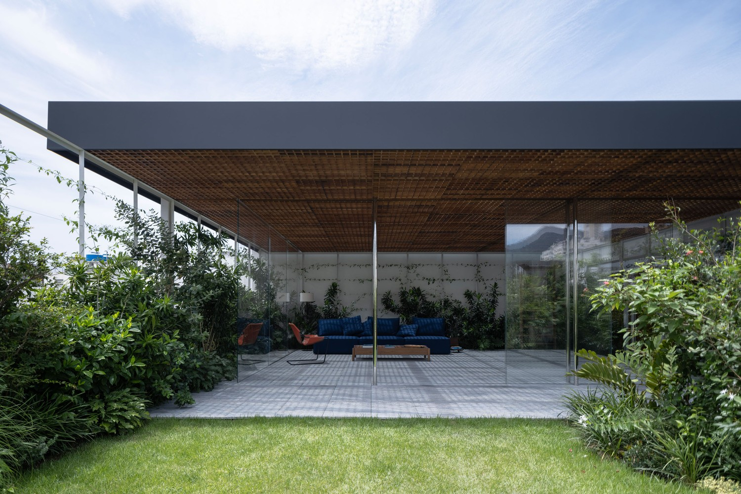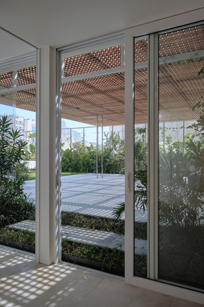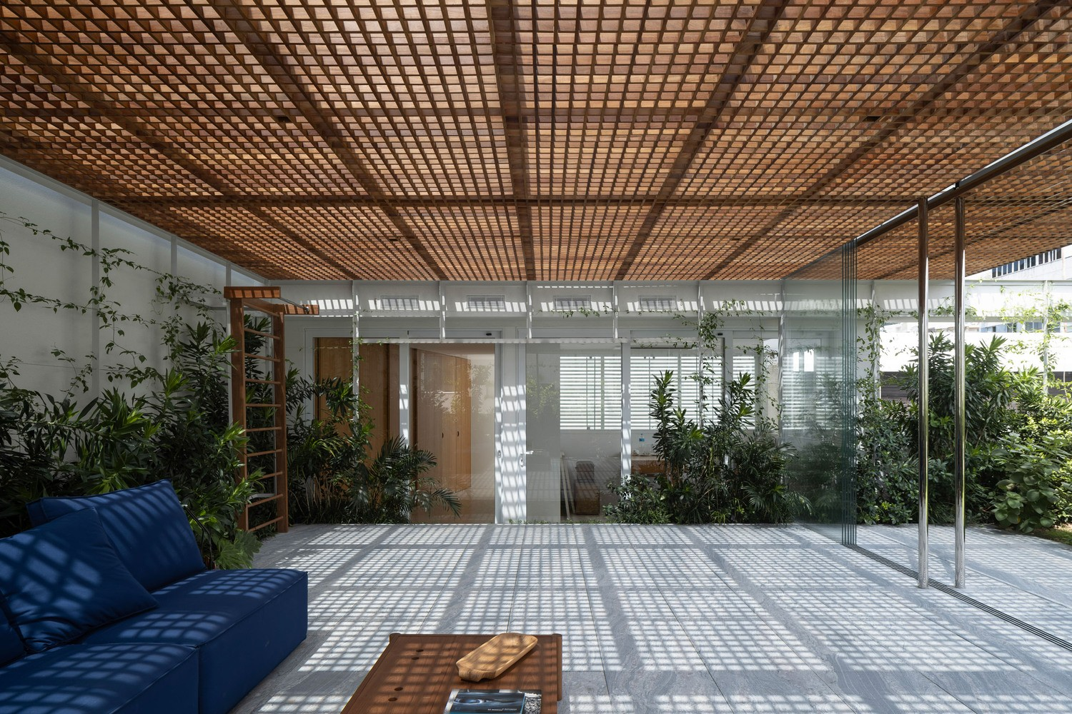Một phần của không gian nội thất này được bao phủ bởi mái kính nhẹ và lưới gỗ, cho phép ánh sáng tự nhiên len lỏi khắp không gian, nhưng vẫn tránh được bức xạ mặt trời.
