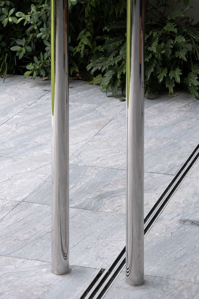 Kiến trúc sư sử dụng các cột đôi làm bằng ống thép không gỉ đánh bóng để hỗ trợ mái nhà, việc này giúp ngôi nhà trở nên thông thoáng và giảm trọng tải lên kết cấu tòa nhà bên dưới.