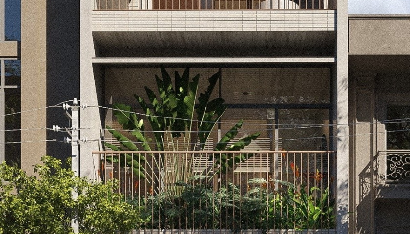 Phần mặt tiền ở các tầng bố trí hệ cây xanh để giảm nắng nóng và lớp bụi mịn trong không khí. Phần hình khối vươn ra của cầu thang tạo sự mới lạ cho mặt tiền.