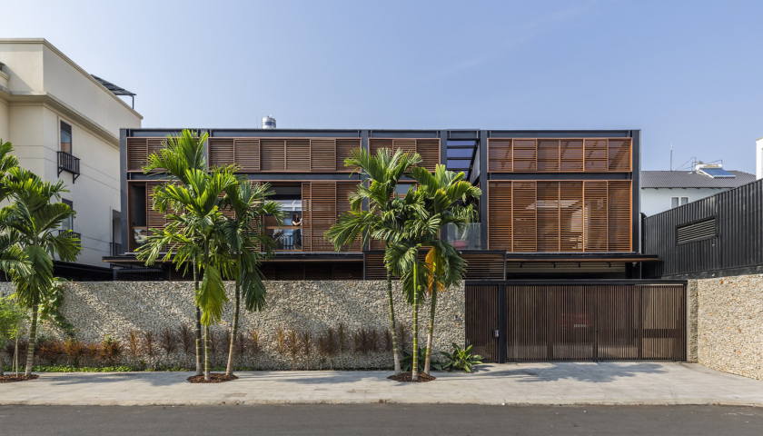 Để đáp ứng nhu cầu của chủ nhà, kiến trúc sư xây dựng giải pháp thông minh “mặt tiền 2 lớp”. Cấu trúc gồm hệ thống cửa chớp gỗ đã xử lý bằng nhiệt bên ngoài, kết hợp với cửa kính trượt bên trong. Đây là giải pháp đảm bảo ánh sáng mặt trời và gió kết hợp với các nguyên tắc của phong thuỷ. Do đó, ngôi nhà luôn thoáng.