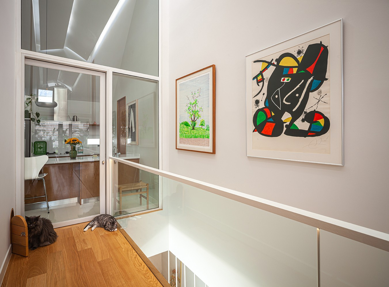 Việc sử dụng vật liệu mờ ở hàng rào khối kính và tấm mờ cho mái hiên vừa giúp giảm độ rắn chắc của khối, vừa giúp đảm bảo sự riêng tư của người ở.