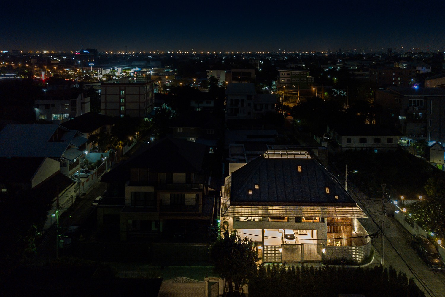Các kiến trúc sư đã thiết kế trần dốc ở hai bên nhà để tăng sự riêng tư cho gia chủ.