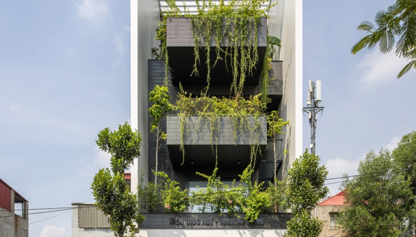 Khối công năng phía trước được lùi vào 2 m để tạo ban công đua ra ngoài, trồng cây tạo bóng mát. Giải pháp này giúp hạn chế nắng trực tiếp từ 12h-16h mỗi ngày.