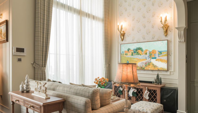 Phòng khách của căn hộ nổi bật với màu xanh chủ đạo. Đồ nội thất từ sofa, ghế tựa, bàn trà, tủ... đều được lấy nguyên mẫu kiểu dáng từ nội thất đồng quê Anh. Vải bọc hoạ tiết hoa và kẻ sọc đặc trưng làm nổi bật phong cách chủ đạo.