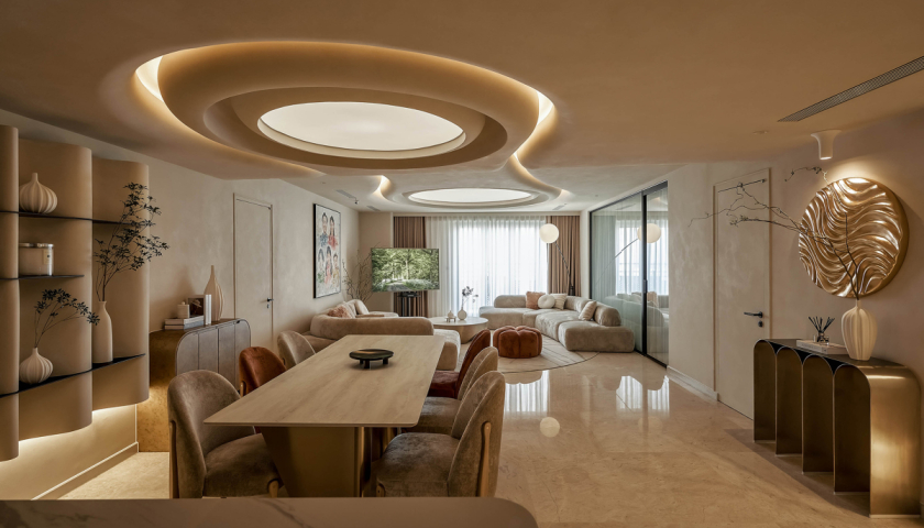 Phong cách wabi sabi được lựa chọn nhằm tạo điểm nhấn, tăng yếu tố nghỉ dưỡng. Phòng khách với những đường cong mềm mại, hệ trần xuyên sáng, nội thất thiết kế riêng.