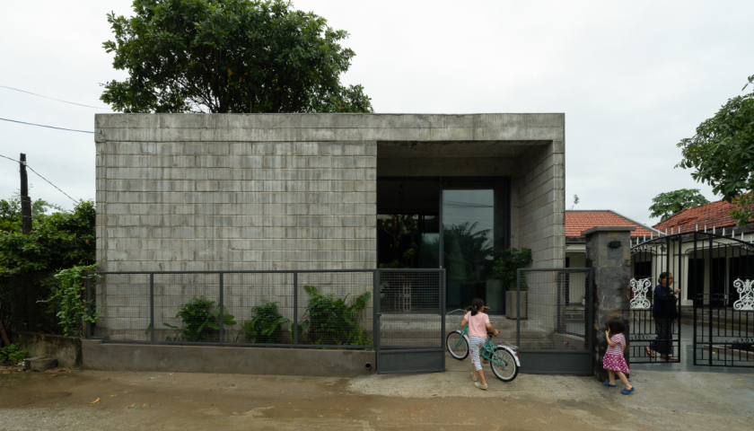 Triết lý thiết kế của ngôi nhà có sự kết hợp giữa các yếu tố tự nhiên với kiến trúc tối giản. Mặt ngoài được làm từ gạch block (gạch nhẹ không nung) không tô trát, mang lại vẻ thô mộc và phù hợp với cảnh quan thôn quê. Cấu trúc gạch block trần có ưu điểm chi phí thấp, giảm tác động môi trường, khi kết hợp với các cột và mái bê tông thô mang lại cảm giác mạnh mẽ hiện đại nhưng vẫn gần gũi với bản sắc địa phương.