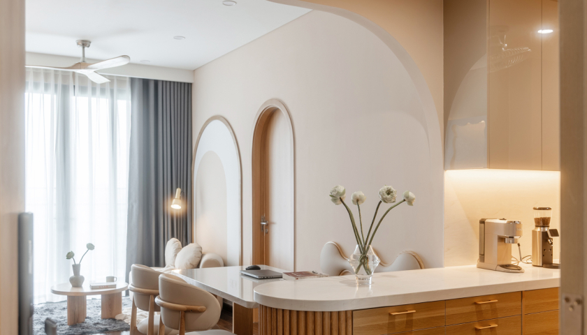 Đường cong cũng xuất hiện ở các chi tiết kiến trúc như trần nhà vòm hoặc các bức tường, cửa ra vào... giúp liên kết không gian.