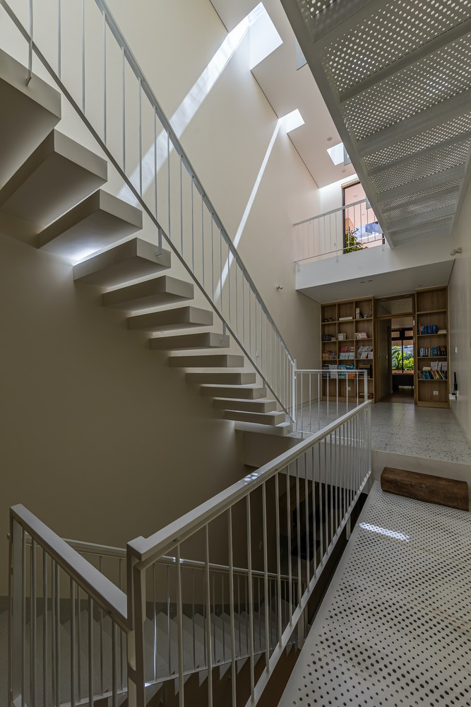 Kiến trúc sư đề xuất thiết kế nhà lệch tầng và cắt giảm diện tích sàn ở các tầng trên để tăng kết nối theo chiều dọc, đồng thời tạo lối đi cho ánh sáng ban ngày chiếu sâu hơn vào tòa nhà. Từ tầng trên cùng, mọi người vẫn có thể giao tiếp với nhau.
