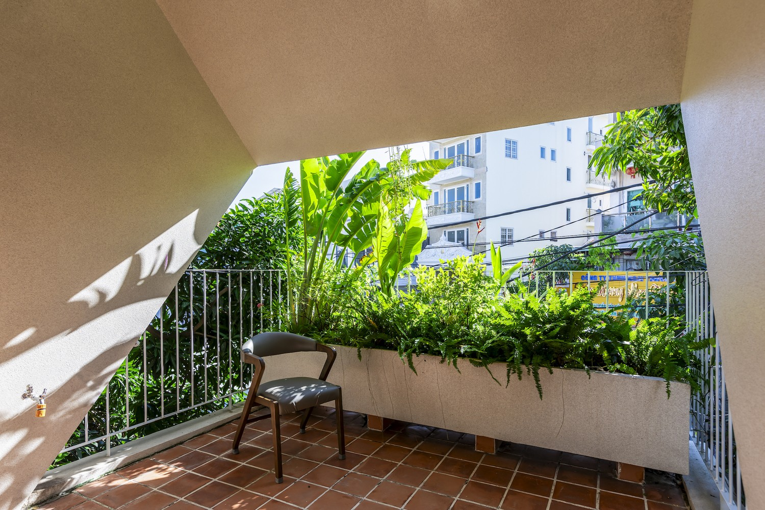 Không gian sân thượng ở tầng 3 được thiết kế theo kiểu bán khép kín, giúp giảm nhiệt, tiếng ồn giao thông và tầm nhìn khó chịu ra xung quanh, nhưng lại mở ra bầu trời riêng tư, có thể là nơi tụ họp của tất cả các thành viên trong gia đình và bạn bè hoặc trở thành không gian tập yoga hay thiền.