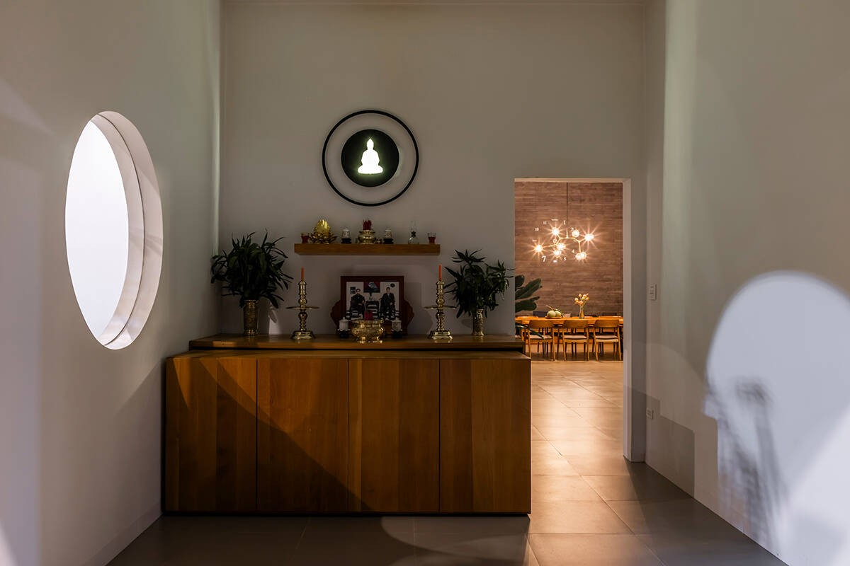 Với giải pháp bố trí mặt bằng công năng như vậy, ánh sáng, không khí có thể tiếp cận bên trong từ bốn hướng, qua đó, giúp bên trong ngôi nhà khi nào cũng mát mẻ và ngập tràn ánh sáng.