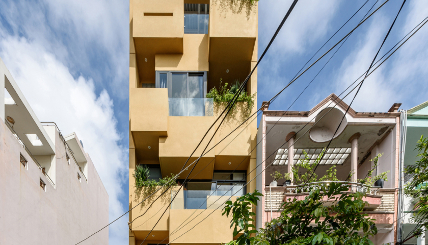 Mặt tiền của ngôi nhà được tạo hình từ các khối hộp kết hợp từ ban công và bồn cây. Các khối hộp như đan xen và chuyển động, trượt vào nhau và len lỏi vào sâu bên trong nội thất, tạo nên những mảng xanh cho căn nhà.