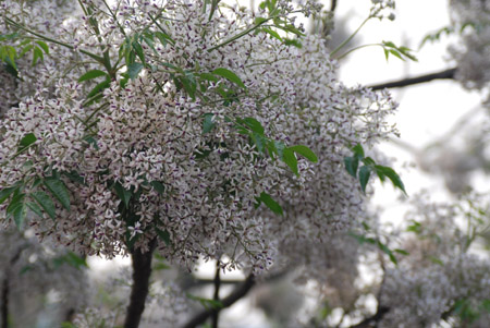 Suốt mùa đông âm thầm khẳng khiu trụi lá, đến đầu xuân khi đất trời mịt mờ mưa bụi bay, những cành xoan già nua, mốc thếch hôm nào bắt đầu “trào” ra những mầm lộc bé xíu phủ một lớp lông tơ trắng mịn trông như cây nến trắng, e ấp, ngơ ngác nhìn bụi mưa lất phất giữa trời. Rồi một thời gian, khi “mùa con ong đi lấy mật” đến, hoa xoan nở từng chùm tim tím nơi đầu cành, lan tỏa những làn hương thoang thoảng. Mùa xoan nở hoa, sáng thức dậy, khắp không gian, ngõ ngách đường quê hoa xoan rụng trắng như trải thảm. Hoa xoan không có vẻ đẹp rực rỡ, cũng không có hương thơm quyến rũ như hoa hồng, nồng nàn như hoa sữa. Hoa xoan đẹp với một vẻ đẹp giản dị giống như bản chất mộc mạc của người nông dân, hoa được người quê coi là người bạn thân thiết.