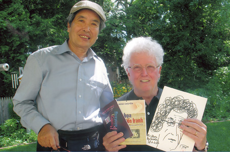 Nhà văn Minh Chuyên tặng tập truyện “Di họa chiến tranh” cho giáo sư Kevin Bowen trong dịp dự hội thảo văn học quốc tế Boston tại Mỹ ngày 17/6/2014.