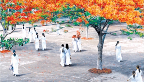 Kia rồi! Cổng trường hiện ra trước mắt tôi. Chao ôi! Trường đổi thay nhiều quá, khang trang, sạch đẹp hơn. Hàng phượng thưa thớt xưa giờ đã được trồng thêm những cây phượng, cây bàng tán lá sum suê reo vui trong gió.