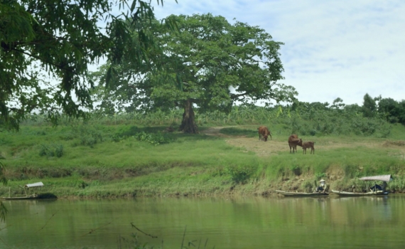 - Gốc làng quê em ở trong xóm Chum kia kìa. Năm nào cũng bị úng lụt. Cái làng em ngón chân đứa nào cũng tõe. Vì quanh năm lội nước, lội bùn. Sau này một số nhà bỏ làng ra ngoài bãi sinh cơ lập nghiệp. Ra ngoài bãi thì không bị úng lụt. Nhưng năm nào, mùa lũ nước sông cũng ngập nước. Qua mùa lũ, nước rút, phù sa đọng ngập bàn chân trên sân nhà em. Nhưng mà cây cối tốt lắm. Chỉ khổ là cuộc sống bấp bênh những ngày mưa lũ.