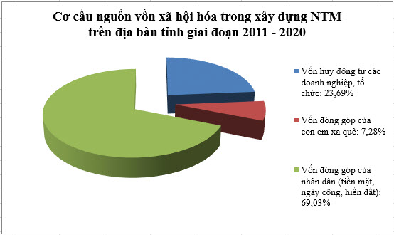 Theo thống kê, trong tổng nguồn lực huy động xây dựng NTM toàn tỉnh giai đoạn 2011 - 2020 khoảng 22.236 tỷ đồng thì nguồn vốn huy động xã hội hóa chiếm tới 24%, trong đó nguồn vốn huy động từ các doanh nghiệp, tổ chức 1.259,3 tỷ đồng, nguồn vốn con em xa quê đóng góp 386,99 tỷ đồng và nguồn vốn huy động nhân dân đóng góp (tiền mặt, ngày công, hiến đất) 3.669,5 tỷ đồng. Việc huy động xã hội hóa và sử dụng có hiệu quả các nguồn lực trong dân cư đã góp phần đưa Thái Bình trở thành 1 trong 3 tỉnh dẫn đầu cả nước về xây dựng NTM.