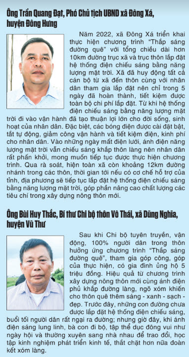 Chương trình “Thắp sáng đường quê” là chủ trương đúng, trúng, hợp lòng dân, không chỉ khai thác tiềm năng, nguồn lực sẵn có trong dân mà còn mở ra hướng đi mới trong khai thác, sử dụng các nguồn năng lượng tái tạo, năng lượng mới, năng lượng sạch để phục vụ đời sống, sinh hoạt và sản xuất của nhân dân. Ánh điện không chỉ xua tan bóng tối, bảo đảm an ninh trật tự, an toàn giao thông mà còn góp phần nâng cao đời sống vật chất, tinh thần cho nhân dân; đồng thời, khẳng định quyết tâm của Đảng bộ, chính quyền và nhân dân Thái Bình chung sức đồng lòng xây dựng thành công nông thôn mới nâng cao, nông thôn mới kiểu mẫu.
