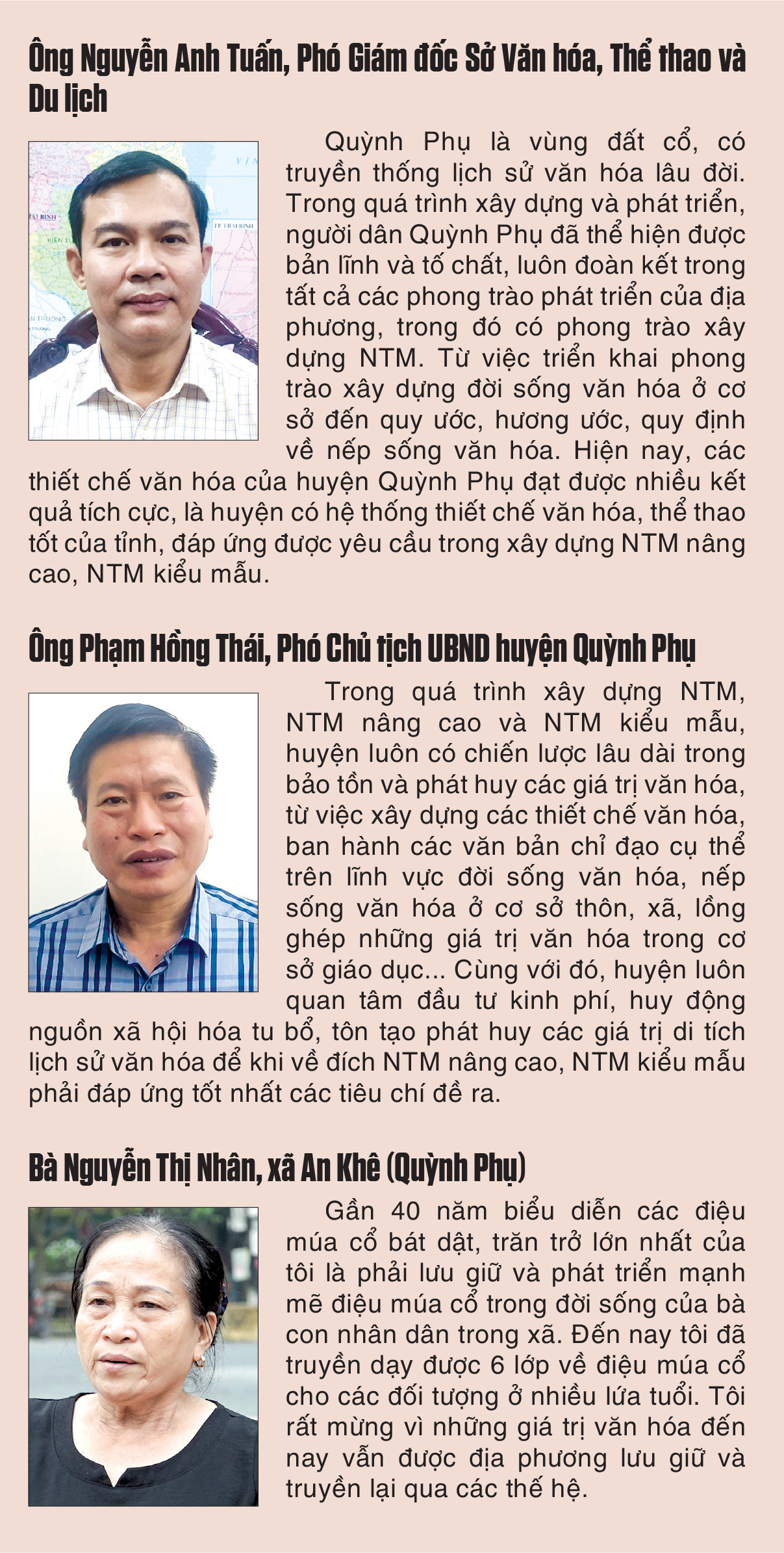 Quỳnh Phụ là huyện có truyền thống văn hóa lịch sử và phong trào cách mạng phát triển từ rất sớm; có nhiều di tích lịch sử văn hóa có giá trị truyền thống lâu đời như đền Đồng Bằng (xã An Lễ), đền La Vân (xã Quỳnh Hồng), đền A Sào (xã An Thái), đền Mẫu Đợi (xã Đông Hải)... Phát huy giá trị truyền thống của địa phương, trong công cuộc xây dựng NTM, huyện xác định văn hóa giữ vai trò rất quan trọng trong việc nâng cao đời sống tinh thần của nhân dân. Những năm qua, cấp ủy đảng, chính quyền từ huyện đến cơ sở đã tập trung lãnh đạo, chỉ đạo tổ chức thực hiện hiệu quả công tác giáo dục, phát huy truyền thống văn hóa, văn hiến, yêu nước, cách mạng của quê hương cho cán bộ, đảng viên và các tầng lớp nhân dân trong huyện.