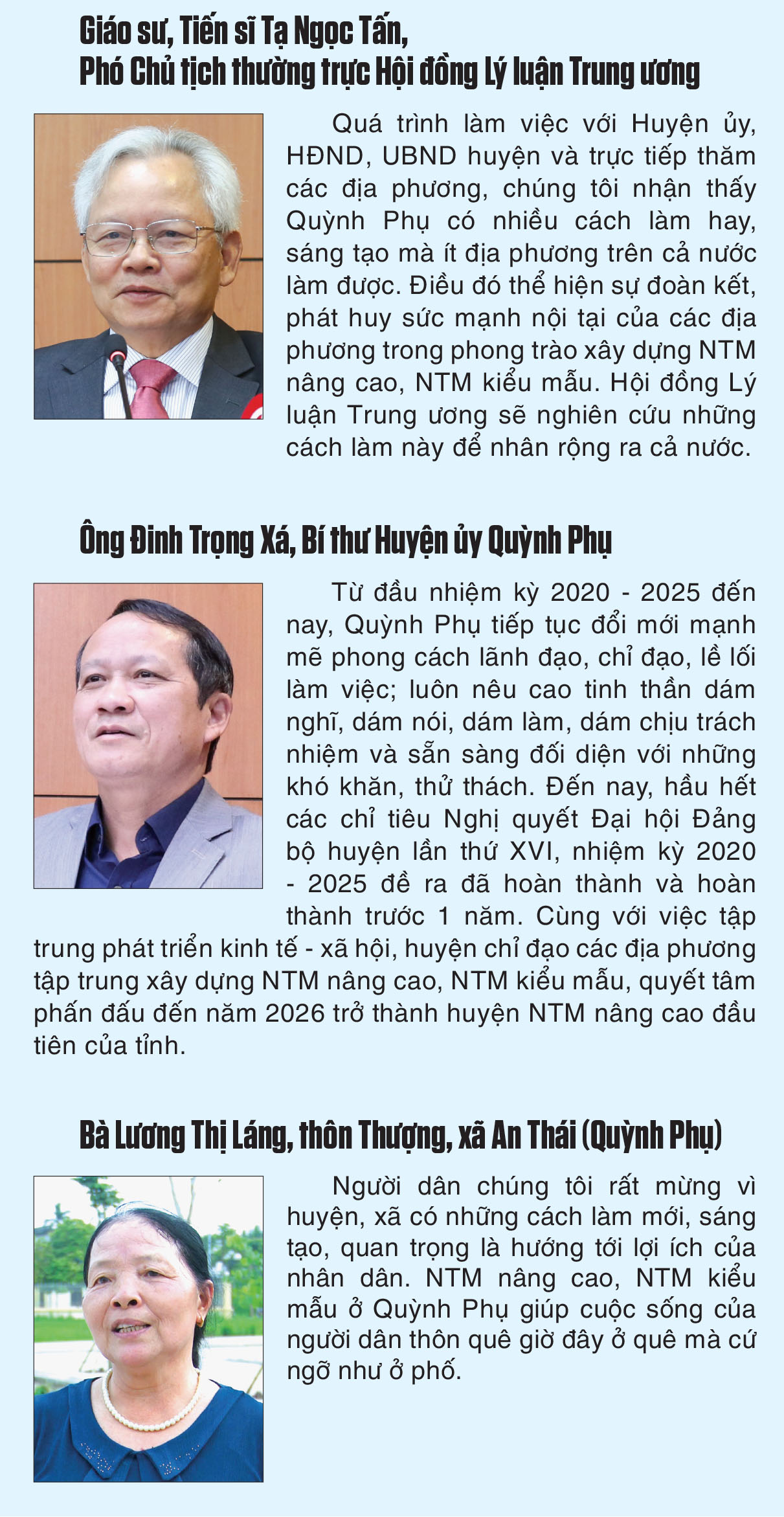 Với những cách làm mới, năng động, sáng tạo, sự linh hoạt từ các nghị quyết, cơ chế được ban hành, Quỳnh Phụ tự tin đến năm 2026 sẽ trở thành huyện NTM nâng cao đầu tiên của tỉnh. NTM đã, đang và sẽ tạo nên bức tranh tươi sáng ở nhiều địa phương trên địa bàn huyện.