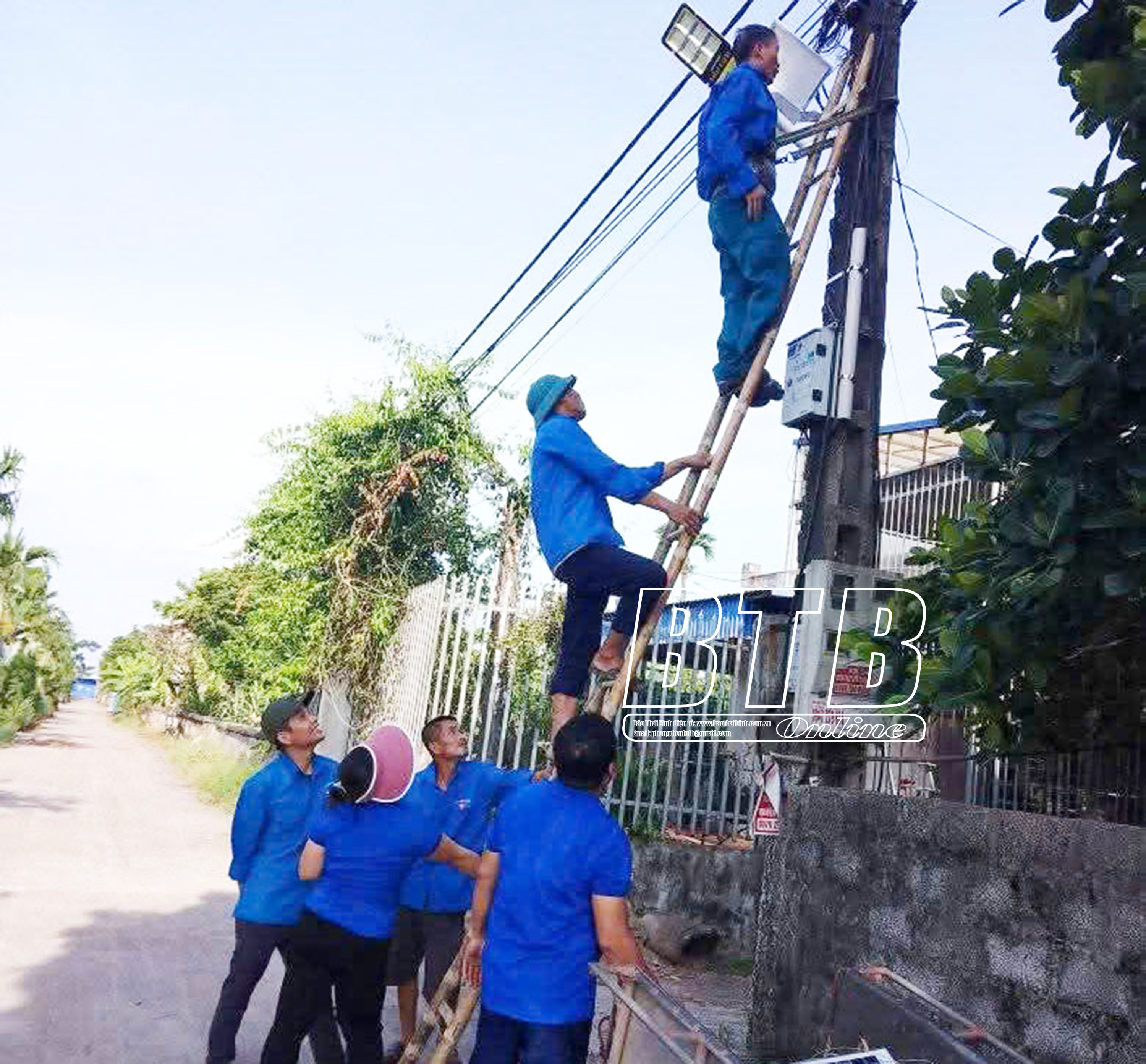 Thanh niên xã Hồng An duy trì bảo dưỡng đèn điện chiếu sáng.