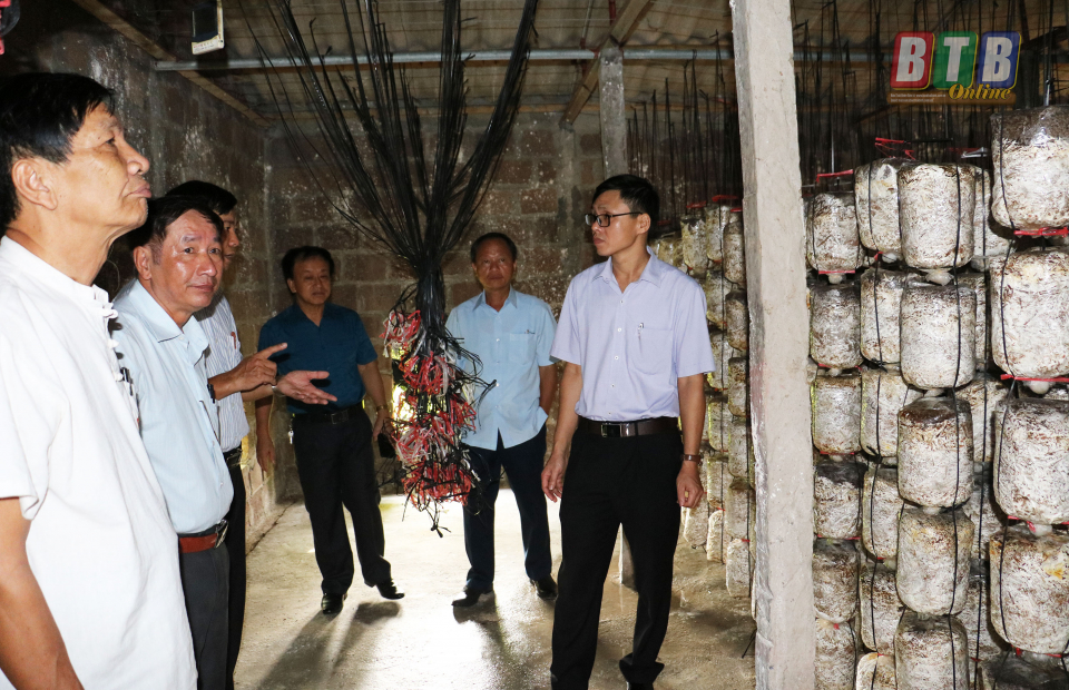 Đoàn nghiên cứu thực tế tại Cơ sở sản xuất nấm Quốc Doanh (xã Bình Định).