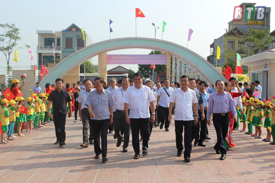 Các đồng chí: Trần Thanh Nam, Thứ trưởng Bộ Nông nghiệp và Phát triển nông thôn; Đặng Trọng Thăng, Phó Bí thư Tỉnh ủy, Chủ tịch UBND tỉnh và các đại biểu tham quan Trường Mầm non An Bài (thị trấn An Bài), Quỳnh Phụ.